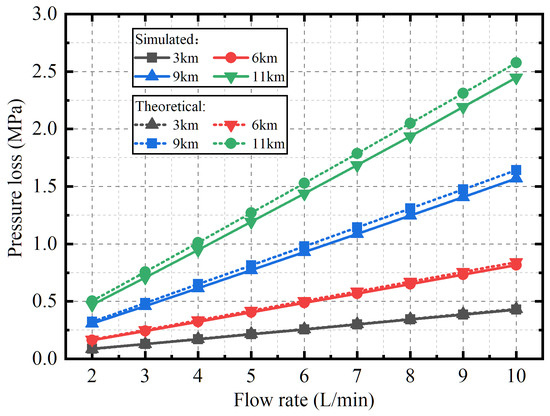 In the model established in this study, the novel formula expressed by Equation (9) is used to calculate the pipeline pressure loss, and this formula is also used in the energy saving control strategy described in Section 2.2.1. Therefore, it is necessary to ensure that the pipeline pressure loss obtained by the simulation is consistent with Equation (9). Figure 7 depicts the simulated pipeline pressure loss in a single slender pipeline at different depths together with theoretical values calculated by Equation (9). It shows that the simulated pipeline pressure loss is consistent with the theoretical value at different depths and different flow rates. Among them, the maximum error is –6.7% compared with the theoretical value. Figure 7 also shows that the pipeline pressure loss varies greatly at different subsea depths, which has significant influence on the working performance and energy efficiency of the deep-sea VCHCS at different depths. The working performance and the energy efficiency of the deep-sea VCHCS are just what the proposed control strategy in this research is supposed to deal with.