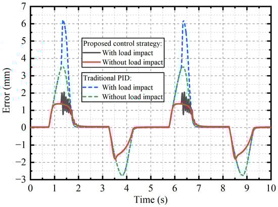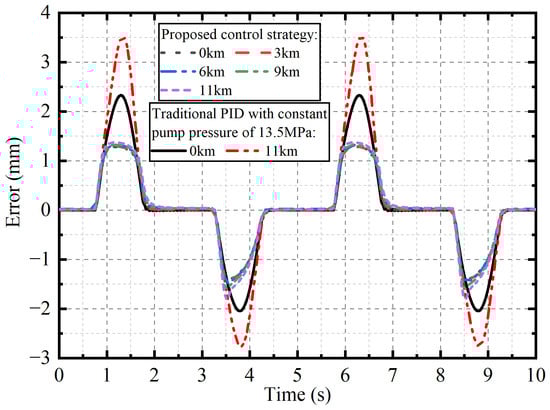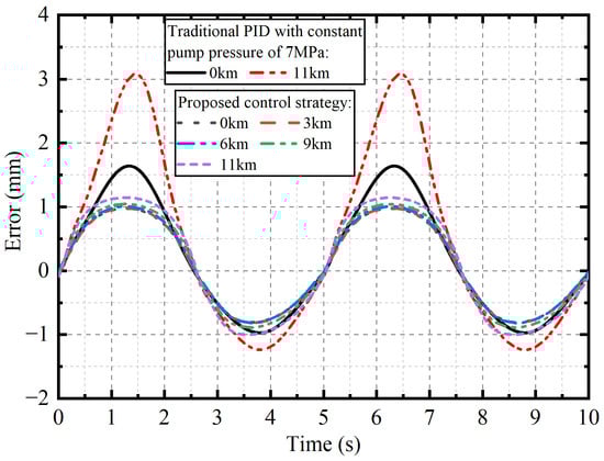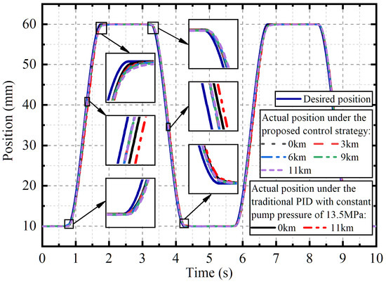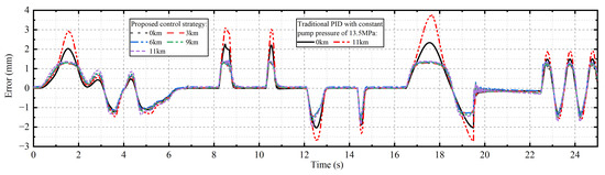 Figure 8 depicts the tracking performance of the deep-sea VCHCS at different depths in the sea while performing a multi-step movement, and Figure 9 shows the corresponding tracking errors. As a comparison, the results with traditional PID control and constant pump pressure are also plotted in the figures. It can be known from Figure 9 that the control strategy proposed in this research has better control accuracy compared with the traditional PID control combined with constant pump pressure when performing the multi-step motion. In addition, the proposed control strategy also presents the advantage that the control accuracy is basically the same under different working depths.