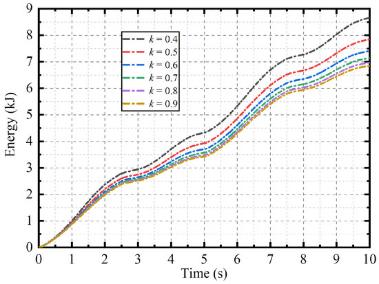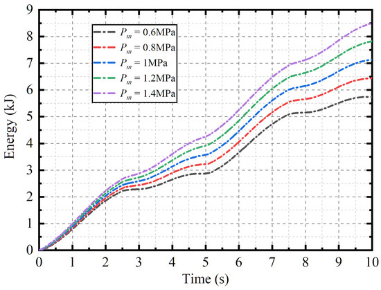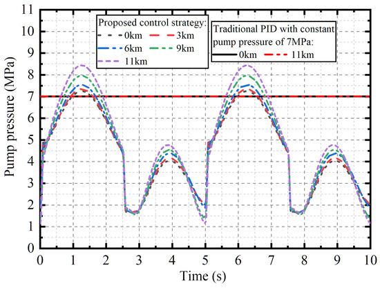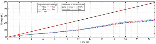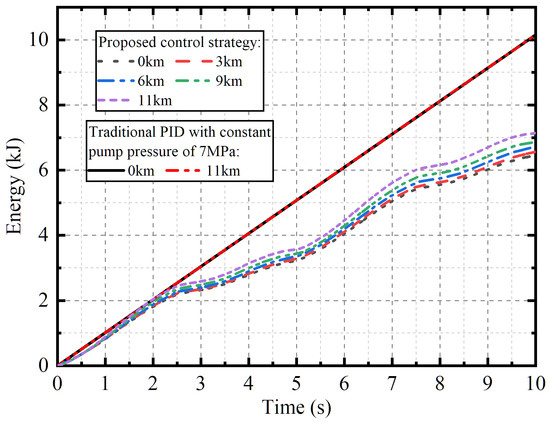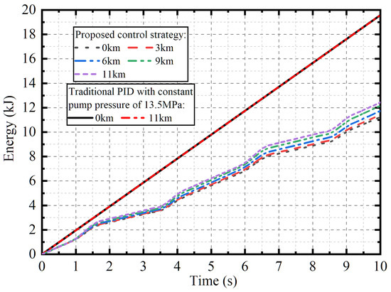 Figure 10 and Figure 11 depict the pump pressure and the energy consumption of the deep-sea VCHCS at different depths in the sea while performing a multi-step movement. It can be known from Figure 10 that the proposed control strategy realizes the adaptive adjustment of pump pressure. The variations in pump pressure at different working depths are consistent with each other. The deeper the depth in the sea is, the greater the pump pressure is. This is due to the increase in the viscosity of the hydraulic oil caused by the ambient pressure and, subsequently, the increase in the pipeline pressure loss. Since the pump pressure can be adjusted adaptively, the proposed control strategy also realizes the energy saving of the deep-sea VCHCS, as shown in Figure 11. When compared to traditional PID control with 13.5 MPa pump pressure, the proposed strategy can save energy by 43% on land and 36.5% at 11 km depth in the sea.