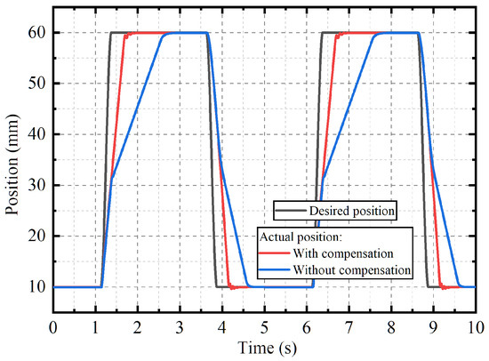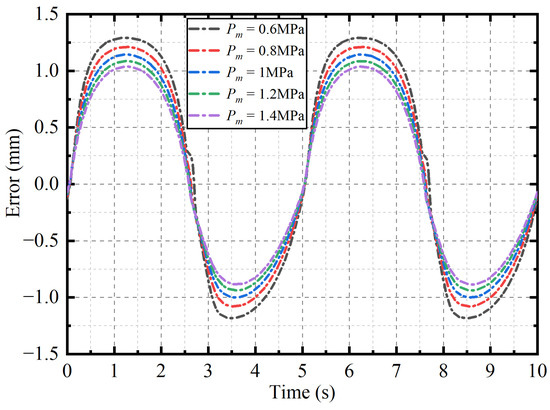 According to Equation (23), the error-related compensated pump pressure, , is 0 when the error is less than , which is an allowable smaller error threshold. When , is directly set to the maximum cracking pressure of the relief valve, , since an error larger than the set has seriously affected the position accuracy. When is between and , the value of increases linearly from to .