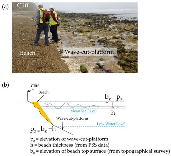 Wave-cut platforms are often covered by beach deposits and its position can be obtained from beach thickness and beach elevation: (a) photo taken near Trimingham, East England showing a cliff, beach, and wave-cut platform (source BGS); (b) schematic showing how wave-cut platform elevation can be obtained from beach thickness and beach elevation observation.
