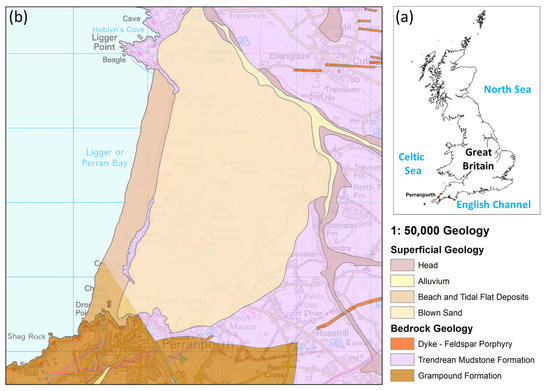 Study site location: (a) Great Britain High Water Mark; (b) Perranporth Beach showing the superficial and bedrock geology of the study area. Map shown in metric scale using British National Grid (blue grid). For reference, the latitude and longitude of Ligger Point is 50°22′48.0″ N, 5°09′21.7″ W.
