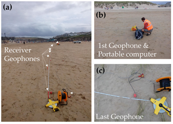 Photos (source BGS) illustrating a typical MASW field configuration showing the chain of receiver geophones (a) and details of first (b) and last geophone (c).