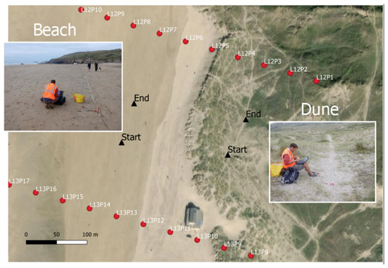 We used a chain of nine vertical geophones (SoilSpy Rosina) with a receiver spacing of 5 metres, resulting in a total length of 40 metres and the surface waves phase velocity spectra module in Grilla software (v7.0) for processing. We conducted two MASW surveys on 8 September 2017, first on the beach (on 23 August 2017 starting at 17:12) and then on the dune (on 23 August 2017 starting 17:36), as shown in Figure 5. The beach survey was conducted on the intertidal and the sand was still wet from the last high tide of the day. The dune transect was conducted along a path free of vegetation, as shown in Figure 5. The single station measurements points 6, 7, and 8 on Line 12 and points 13, 14, and 15 on Line 13 were the closest to the beach transects and about 160 m away from the transects’ centre location.