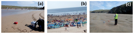 Perranporth Beach is located on the north coast of Cornwall, SW England (Figure 2a). The beach is approximately 3.5 km long and faces WNW into the Celtic Sea. Due to its exposed location, the wave fetch at Perranporth is significant, reaching several thousand kilometres across the Atlantic Ocean. The beach is enclosed by the headlands of Ligger Point (North) and Cligga Head (South) with a 1 km section of cliffs located toward the southern end of the bay (Figure 2b). The beach at Perranporth is composed of beach and tidal flat deposits (undifferentiated). Typically, the upper beach consists of well-sorted medium sand and the lower beach of very well-sorted medium sand [6]. An extensive area of blown sand overlies the bedrock landward of the beach (Penhale, Gear, and Reen Sands). The beach is backed by an extensive dune system both in the north and south that is divided by a small headland (Cotty’s Point). The beach and sand dunes are underlain by the Trendrean Mudstone Formation (Devonian). It is composed of dark grey, locally black, mudstone with some laminae of siltstone and fine-grained, dark grey sandstone [7]. Thin beds of light grey siltstone and beige fine sandstone are also locally present. The formation is exposed in the headland to the north of the bay, Ligger Point, and the cliffs backing the southern half of the bay (Cetty’s Point). The headland (Droskyn Point and Cligga Head) to the south of the bay is formed of the Grampound Formation (Devonian). This consists of laminae and thin beds of siltstone and sandstone [7].