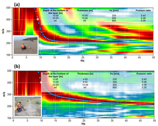 Figure 7 shows the observed and modelled surface wave velocity dispersion curves at the beach and in the dunes. The maximum depth of investigation can be estimated from the recorded phase velocity at which the minimum frequency of the fundamental mode on the dispersion curve is clearly defined. The fundamental frequency mode was identified as the curve with the lowest velocity values for each frequency. For the beach record, the minimum frequency was approximately 8 Hz and the corresponding velocity was around 400 m/s. By dividing 400 m/s by 8 Hz, we obtain 400 m/s/8 Hz = 50 m. This is the maximum Rayleigh wavelength (λmax) that can be recognised from this survey. The maximum wavelength of investigation was not the maximum depth of investigation. Rayleigh waves in fact induce the major part of the ground displacement at depths between 1/3 and 1/2 of their wavelength. It is therefore generally assumed that the velocity at which a Rayleigh wave is moving refers to a depth between λmax/3 and λmax/2. In this case, by dividing the maximum wavelength by 2, we had an estimation (by excess) of the maximum depth of investigation achieved by the survey as λmax/2 = 50/2 = 25 m depth. The modelled Rayleigh wave velocity dispersion curve (Figure 7a) was obtained assuming the 1D Vs profile shown in Figure 7a, suggesting that the Vs was 220 m/s for the first 10 m, then Vs = 500 m/s until 25 m depth (i.e., first layer was 10 m thick and second layer was 15 m thick). The average Vs could be obtained as (10/25) × 220 + (15/25) × 500 = 388 m/s for the beach top layer. For the dune survey, the minimum frequency was approximately 10 Hz and the corresponding Vs was around 400 m/s. By dividing 400 m/s by 10 Hz, we obtained λmax = 400 m/s/10 Hz = 40 m and the maximum depth of investigation achieved by the survey was λmax/2 = 40/2 = 20 m. The modelled Rayleigh wave velocity dispersion curve (Figure 7b) was obtained assuming the 1D Vs profile shown in Figure 7b, from which it can be inferred that the bedrock interface was around 23 m depth and close to the depth of investigation. The average Vs could be then obtained as (4/23) × 230 + (9/23) × 300 + (10/23) × 500 = 374 m/s for the dune top layer. It was observed that the differences between the averaged Vs obtained for the beach and dune (374 m/s + 388 m/s)/2 = 381 m/s was less than ± 2%.