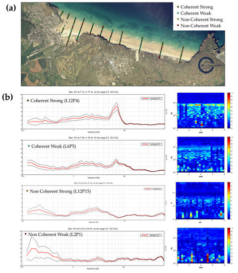 Figure 8a shows the spatial distribution of the four identified categories. The non-coherent weak data appeared to correspond with either the dunes, dry beach, or lower beach. The measurements taken on the dunes need to be interpreted with caution as vegetation was present (e.g., Marram grass), which can cause non-coherent-noise signal, even under low wind conditions, and poor sensor to ground coupling. It was also notable that a number of non-coherent weak records occurred at the end of each transect near the low water mark. This is believed to be mainly due to the saturated nature of the sediment, which made it difficult to securely couple the Tromino instrument in place. Interference from waves breaking just offshore, or again possibly due to bathers/people who tend to congregate/walk along the edge of the water line, could also have had a negative effect on the quality of the data. Another factor that may cause poor data returns is wind, which was relatively high (gusts up to 24.2 mph) for the duration of the survey.