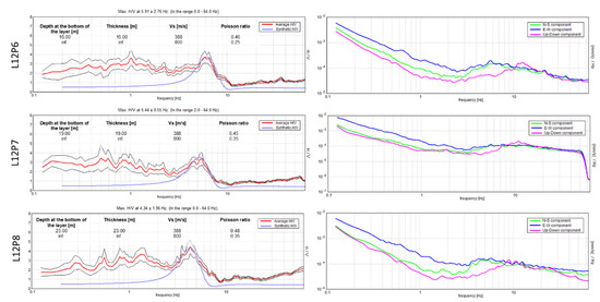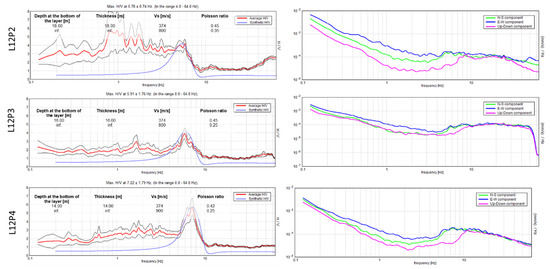 Single station H/V observed and modelled at the three nearest stations to the dune MASW location. The labels L12P2-4 indicate the points 2, 3, and 4 on line 12. The right panels show the single component spectra as solid blue, green, and magenta lines. The left panels showed the averaged H/V as a solid red line, with the standard deviation as thinner black lines. The modelled or synthetic spectra are shown as a blue line and the main model parameters are shown as text.