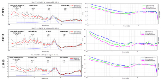 Single station H/V observed and modelled at the six nearest stations to the beach MASW location. From top to bottom, the labels LIPJ indicate points 6, 7, and 8 on line 12 and points 13, 14, and 15 on line 13. The right panels show the single component spectra as solid blue, green, and magenta lines. The left panels show the averaged H/V as a solid red line, with the standard deviation as thinner black lines. The modelled or synthetic spectra are shown as a blue line and the main model parameters are shown as text.