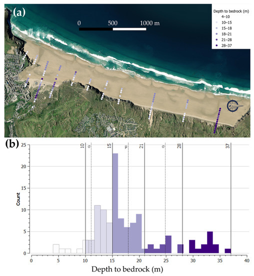 Depth to bedrock frequency spatial (a) and frequency distribution (b) obtained from the PSS sampled at Perranporth Beach. The vertical lines in (b) represent the max and min value for each colour group.