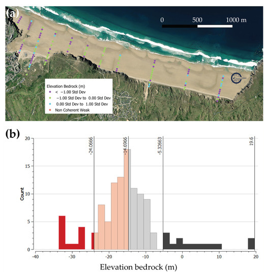 Elevation of the bedrock spatial (a) and frequency distribution (b) obtained from the PSS sampled at Perranporth Beach. The vertical lines in (b) represents the max and min value for each colour group.