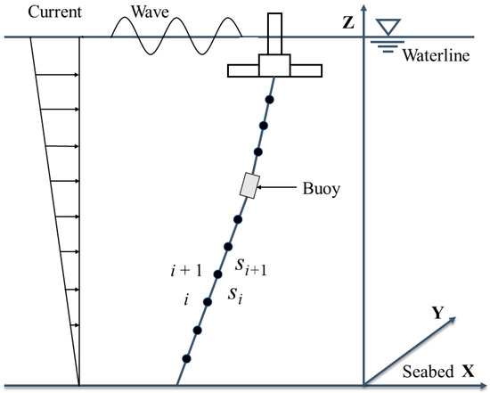 Compared with the massless spring model and the nonlinear beam model, the lumped mass method can fully consider the wave–current load on the floating platform and the tension tendon. It is suitable for the hinged connection between the buoy and the mooring system, so the tendon is simplified to a three-dimensional lumped mass in this method [30,31]. After the model divides the entire tension tendon into n segments, each segment is equivalent to a massless spring, represented by Si (i = 1, …, n), each segment is connected by a mass node, and each node is represented by i (i = 1, …, n). Figure 2 takes a single tendon as an example to show the segmentation of the tendons.