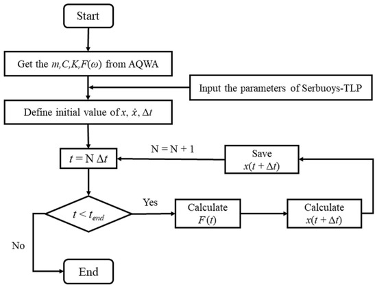 DUTMST 2.0 uses the fourth-order Runge–Kutta method to solve the differential equation system in Equation (13). The solution flow chart of DUTMST 2.0 is shown in Figure 4. The solution is divided into two parts: firstly, the hydrodynamic information of the floating platform and the buoy calculated by AQWA-LINE, including the added mass, radiation damping, hydrostatic stiffness, and wave force under different frequencies, is obtained through a function written by ourselves and inputted into each matrix of the equations of motion; then the tension vector at this time step is calculated by the real-time position of the floating platform, nodes, and buoy. Iteration is carried out to solve for the position of the structure at the next time step, and these steps are repeated to obtain the motion response of the platform.