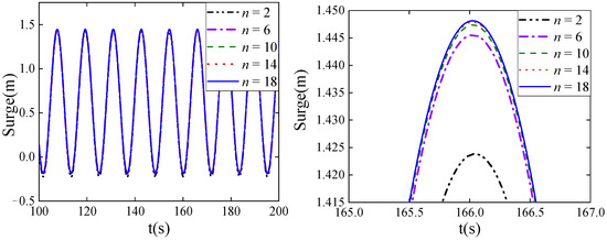 Using the lumped mass method to simulate the tendons needs to consider the influence of the number of tendon segments (n) on the calculated results. As the number of tendon segments increases, the results of calculation gradually converge, but, at the same time, the time cost required for calculation also increases. Table 2 shows the calculation time of DUTMST 2.0 with different numbers of tendon segments. A convergence analysis of the surge response was carried out on a conventional TLP with the following wave parameters: 12 s period, 2 m wave height, 0° wave incidence angle, 0.5 m/s current velocity at the sea surface, and the direction of the current was the same as the wave direction. The tension tendons were divided into 2, 6, 10, 14, and 18 segments, and the surge response of the conventional TLP under these conditions were calculated. The results are shown in Figure 5.