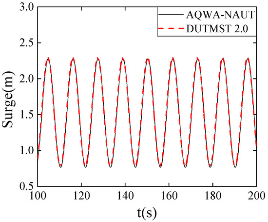 In DUTMST 2.0, we consider the wave–current coupling and the current load on the tension tendon. AQWA-NAUT can also consider the wave–current coupling and the current load, but it is only applicable for calculations with the conventional TLP but not the Serbuoys-TLP. We used the results calculated for a conventional TLP to verify the accuracy of the DUTMST 2.0 wave–current coupling effect. The wave parameters were a period of 12 s, a wave height of 2 m, a wave incidence angle of 0°, a sea surface current velocity of 1.0 m/s, and the current direction being the same as the wave direction. The results are shown in Figure 6. From a comparison of the results, the calculated results of DUTMST 2.0 and AQWA-NAUT are the same. The hydrodynamic parameters and wave loads of both were calculated by AQWA-LINE, which proves that the wave–current coupling effect considered in DUTMST 2.0 is accurate.