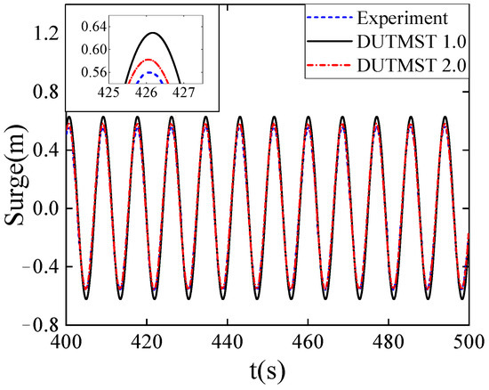To confirm that the DUTMST 2.0 program could accurately calculate the surge response of the Serbuoys-TLP, its calculated results were compared with the experimental results of Ren et al. [38], with wave parameters of a period of 8.485 s, a wave height of 3 m, and position of the buoy being 95 m underwater. The results of DUTMST 2.0 and the experimental results are shown in Figure 7, and the results calculated by DUTMST 1.0 based on the massless spring method are also given in this figure. Compared with DUTMST 1.0, the results of DUTMST 2.0 are smaller and in better agreement with the experimental results, indicating that DUTMST 2.0 can calculate the Serbuoys-TLP surge response more accurately. This is as expected, since the concentrated mass method considers the additional mass of the tension tendon and the drag force applied to it, unlike the massless spring method.