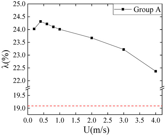 Figure 8 shows the results calculated for Group A, that is, the effect of current velocity on the suppression efficiency λ. The dotted line in the figure represents the surge suppression efficiency of the Serbuoys-TLP under the action of waves, which is about 19%. Under the action of wave–current coupling, the suppression efficiency λ was about 24%. The excellent surge performance of the Serbuoys-TLP was better reflected under the action of waves and currents, which is because the current made the equilibrium position of the platform shift, and the Serbuoys-TLP not only reduced the amplitude of oscillation of the platform about the equilibrium position but also reduced the offset of the equilibrium position. As the current velocity increased from 0 to 0.4 m/s, the suppression effect of the Serbuoys-TLP on the offset of the equilibrium position started to manifest, causing the suppression efficiency λ to increase; as the current velocity continued to increase, the proportion of the increased mooring stiffness of the buoy to the overall mooring stiffness decreased, resulting in a slow decrease in the suppression efficiency λ.