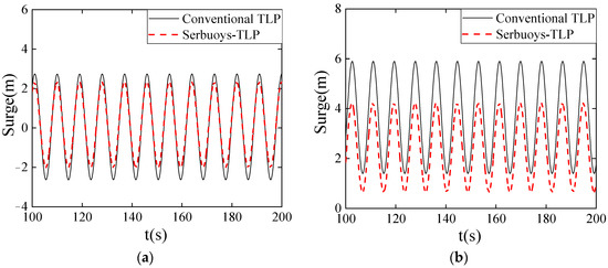 Surge response of the TLPs under the action of waves and currents: (a) the conventional TLP; (b) the Serbuoys-TLP.