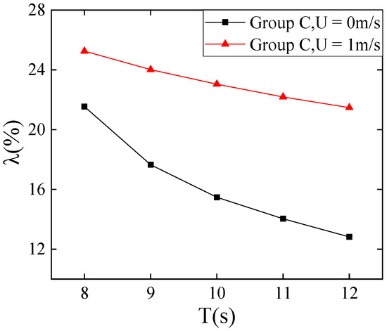 By calculating the surge response of the conventional TLP and the Serbuoys-TLP under Group C conditions, the variation law of the suppression efficiency λ with different wave periods can be given, as shown in Figure 11, from which we see that the suppression efficiency λ decreases with an increase in the wave period in the cases of both wave action and wave–current coupling action. Under the action of waves, the wave period increases from 8 s to 12 s, and the suppression efficiency λ decreases from 21.54% to 12.82%, with a reduction of 8.72%; under the action of wave–current coupling, the wave period increases from 8 s to 12 s, and the suppression efficiency λ decreases from 25.25% to 21.47%, with a reduction of 3.78%. The amplitude of the suppression efficiency λ decreases with an increase in the wave period under wave coupling, and was smaller than that under wave action. The presence of currents makes the platform subject to wave loading at the encounter frequency, and it is known from Equation (7) that the encounter frequency of waves is larger than the wave frequency in the absence of currents, so the reduction in suppression efficiency λ is smaller in the case of wave–current coupling. Compared with the case of wave action, the Serbuoys-TLP can better reflect the superiority of its motion performance under low-frequency wave conditions in the case of wave–current coupling.