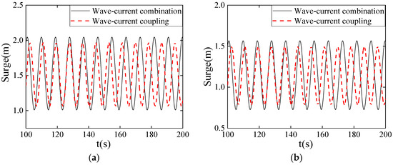The surge time domain curves of the conventional TLP and the Serbuoys-TLP under wave–current coupling and combined wave–current action are given in Figure 12. Disregarding the wave–current coupling effect will make the motion period of the surge larger and will overestimate the maximum surge displacement. η is the effect of whether the waves and currents are coupled on the surge, which is calculated as follows: