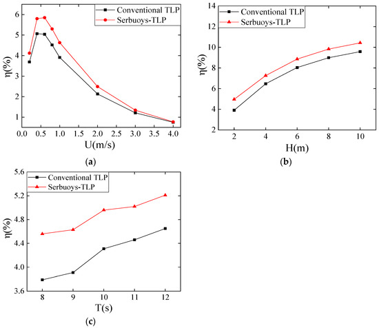 The effect of whether the waves and currents are coupled on the surge of the conventional TLP and the Serbuoys-TLP with different current velocities, wave heights, and wave periods are given in Figure 13. It can be seen from the figure that the effect of whether the waves and currents are coupled on the surge of the conventional TLP and the Serbuoys-TLP is consistent with the variation in current velocity, wave height, and wave period, and the effect of wave–current coupling on the surge response of the Serbuoys-TLP is greater. In Figure 13a–c, the effect of whether the waves and currents are coupled on the surge of the platform increases with an increase in the current velocity and then decreases; it increases with an increase in the wave height, but the magnitude of the increase becomes smaller. It also increases with an increase in the wave period, and the magnitude of the increase is the largest when the wave period increases from 9 s to 10 s. These findings suggest that the wave coupling effect should be considered in the design of a TLP, which would allow designers to not overestimate the surge response of the platform. Even at a high current velocity (greater than 2 m/s), wave–current coupling has little effect on the motion response of the platform, but at a common current velocity (0–1 m/s), this value can still reach 5%. For the Serbuoys-TLP, the wave–current coupling effect has a greater impact on the motion response and should be considered for a more economical design.