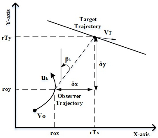 The target model in Equation (2) is dependent on the observer’s position and its maneuver relative to the target trajectory. The observer with position and velocity coordinates is given by the state vector and it is assumed to be moving at a constant speed with its kinematic equations of motion given by: