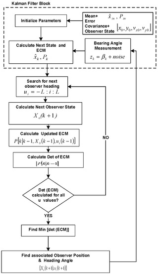 The next step is to find the lowest value in the minimization process of the ECM which is used for calculating the next optimized observer coordinates by using Equations (5) and (6), respectively. Refer to the Flow chart in Figure 2 for the steps in observer trajectory optimization. The optimization criteria using other observer models, such as straight-line Leg by Leg movement, sinusoidal and coordinated turn can be applied to analyze their performance on similar estimation algorithms. These coordinates will also affect the next bearing measurement calculated by Equation (9) incorporating the new optimum observer coordinates. All the above equations are applied in the recursive domain of Bayesian estimation methods which are redefined for optimal observer strategies.