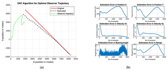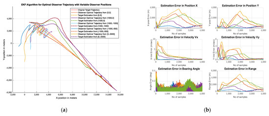 (a) Estimated Trajectories for Variable Initial Positions of Observer using EKF and; (b) Estimated Errors for Position, Velocity, Range, Bearing Angle for Optimal Observer path.