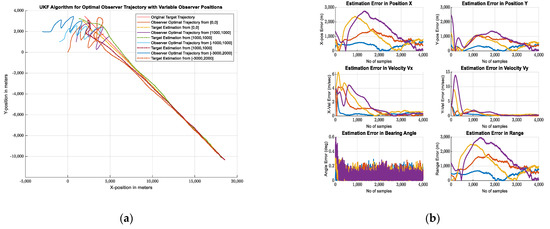 (a) Estimated Trajectories for Variable Initial Positions of Observer using UKF and; (b) Estimated Errors for Position, Velocity, Range, Bearing Angle for Optimal Observer path.