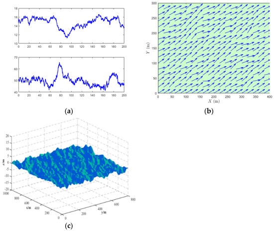 Environment disturbance in fifth sea state. (a,b) 2D planar graph of wind field. (c) Corresponding wind-generated wave.