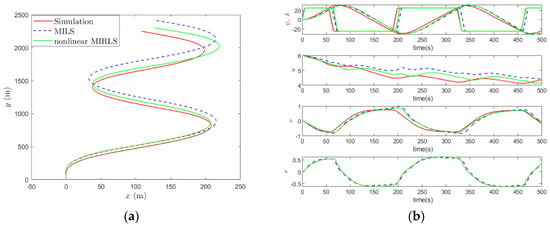 Furthermore, the motion variables of the container ship under three different models (known, MILS, and nonlinear MI-RLS) are shown in Figure 3b, which included the rudder angle δ, the heading ψ, the longitudinal speed u, the lateral speed v, and the yaw rate r. Based on that, during the whole process, the green line is mostly between the red line and the dashed line. This demonstrates that the performance of the nonlinear MI-RLS method is better than the MILS method. In order to increase the reliability of simulation experiments and facilitate repetitive experiments, the final identified parameters (nonlinear MI-RLS) are given in Table 2.