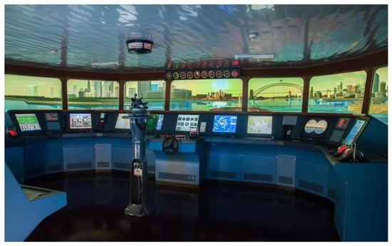 Full mission ship handling simulators have been developed for more than 20 years and have high-precision mathematical models with 6-DOF. The simulators are in full compliance with the STCW 2010, as shown in Figure 4. In particular, the full mission handling simulator has been approved by DNV (class A) and CCS. In this section, we chose a ship “own-ship 1” (OS 1) in the simulator. Then, a turning test and zig-zag test were conducted in the simulator and the trial data (identification data) were downloaded. It is noted that the ship model in the simulator is unknown. The ship model parameters are identified using the trial data by the proposed nonlinear MI-RLS algorithm as shown in Table 3.