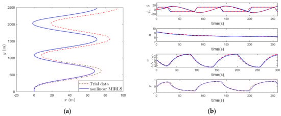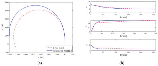As shown in Figure 5, the trial experiment and identified model simulation are compared. It is clear that the turning circle generated by the identified model was smaller than that of the trial experiments. Because the disturbance in the simulation experiment and the simulator experiment was random, discrepancies have appeared between the trial results and the identified model, and with the increase of experiment time, these discrepancies will accumulate and become larger. However, in the initial stage, the error is minute. Figure 5b gives the longitudinal speed u, the lateral speed v and the yaw rate r and we can see that they are similar to each other. From the turning test simulation, the effectiveness of the proposed identification algorithm is satisfactory.