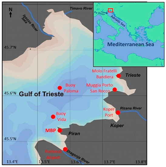 The Gulf of Trieste is the most northern part of the Adriatic and Mediterranean Seas. It is a shallow bay with an average depth of about 25 m. The general circulation in the Gulf is oriented counterclockwise, with an average speed of 1.5 km h−1 [55]. The currents can change to clockwise during strong and long-lasting “burja” or bora (E–NE) wind events [56]. The tides in the gulf are among the largest in the Adriatic Sea, but usually do not exceed 60 cm. The average salinity of 37–38 can fall below 35 in late spring and early summer due to enhanced riverine inflows, especially from the Soča/Isonzo River [57]. The Gulf has a Mediterranean climate with warm summers and cool, rainy winters.