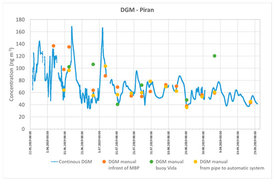 Continuous DGM measurements started in May 2019 and lasted until the end of September 2019. Discrete measurements were performed 15 times during continuous measurements. Both methods were compared and showed excellent agreement (Figure 2), especially at the location in front of the MBP and from tube before continuous system. The DGM concentrations showed high variability, from 37.9 to 137 ng·m−3 (average: 73.5 ng·m−3, standard deviation: 29.6) measured by the discrete method and from 33.2 to 168 ng·m−3 (average: 68.7 ng·m−3, standard deviation: 23.8) measured by the continuous method. Discrete measurements of DGM at buoy Vida agreed well with those measured discrete and continuously at MBP, but had a lower variability, ranging from 40.8 to 121 ng·m−3 (average: 81.8 ng·m−3, standard deviation: 33.0). Higher concentrations at the buoy than at MBP, measured in the end of June and in the beginning of September, are probably due to slightly different geographical positions and environmental and hydrological conditions of both locations (Figure 1). However, similar values and good correlation between buoy Vida and MBP locations were found within previous studies [3]. The DGM concentrations measured in front of Soča/Isonzo River outflow and in the central part of the Gulf of Trieste [3] showed higher values on average (average: 157 ng·m−3, standard deviation: 42.9), ranging between 104 and 212 ng·m−3. Other sampling locations in the Adriatic Sea measured within the same study [3] showed several times lower concentrations, from 14.0 to 132 ng·m−3 (average: 40.6 ng·m−3, standard deviation: 15.2), respectively. Other Mediterranean Sea locations had DGM concentrations in the same range as the southern Adriatic, i.e., 12.0 to 106 ng·m−3 (average: 46 ng·m−3, standard deviation: 22) [13]. In general, DGM values measured in front of the MBP and at buoy Vida were lower than those measured at other, more severely Hg-contaminated locations in the Gulf of Trieste [3,20,34], but higher than those in other locations in the Adriatic and Mediterranean Seas [2,3].