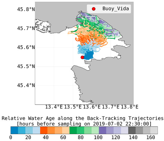 The results of the trajectory modelling (back-propagation) over the week preceding both DGM peaks on 15 June at 02:30 UTC and 2 July at 22:30 UTC are depicted as particle trajectories, with each trajectory being color-coded by the relative water age prior to reaching the buoy Vida location (Figure 5; Figure 6). It is evident that during both DGM events exceeding 150 ng·m−3, a vast majority of trajectories stems from the NE part of the gulf where significantly higher DGM was measured during previous sampling campaigns [3,4,13,22]. In the July event, all trajectories stem from the interior of the gulf and originate in the vicinity of the Soča/Isonzo River mouth. Similarly, in the June event, over 95% of trajectories stem from the gulf interior, while the origin points somewhat more to the south but still in the part of the gulf where DGM is higher than in the vicinity of the buoy Vida. Considering the transport-modelling results, the most probable reason of the increased concentrations during both DGM peaks is transport of DGM-rich seawater by the sea currents from the vicinity of the Isonzo/Soča River outflow.
