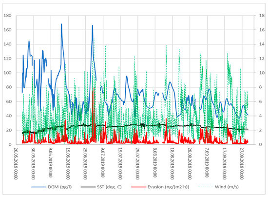 In Figure 7, we present the computed evasion and the measured parameters applied in the equations (Equations (1)–(6)) in 30 min intervals over the entire sampling period. It is evident that the highest evasion occurs only during periods of strong wind. The evasion exceeded 70 ng·m−2·h−1 only in two intervals at the beginning of July, when the wind speed exceeded 10 m·s−1 and the DGM concentrations were higher than 100 ng·m−3. The other periods with either strong wind or high DGM resulted in lower evasion, which rarely exceeded 30 ng·m−2·h−1. The average computed evasion was 5.13 ng·m−2·h−1, with the minimum of 0.90 and the maximum of 78.62 ng·m−2·h−1. Applying a constant TGM of 2.0 ng·m−3 over the entire period or the real wind without the lower limit of 4 m·s−1 resulted in discrepancies lower than 0.5% and only decreased the minimum evasion to 0.012 ng·m−2·h−1. It must be noted that the applied methodology has a much stronger influence on the results, as the variation of evasion by applying various wind parameterizations can reach up to 40%, as described in Andersson et al. [22], Mastromonaco et al. [38], and Tomažič et al. [42]. Furthermore, applying the Wilke and Chang [69] instead of the Kuss [49] parameterization of the diffusion coefficient may increase the evasion results by another 10%.