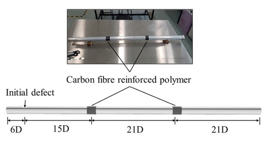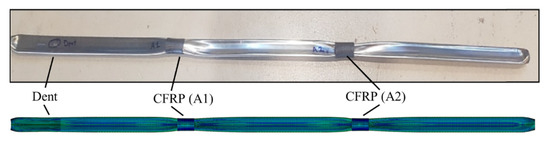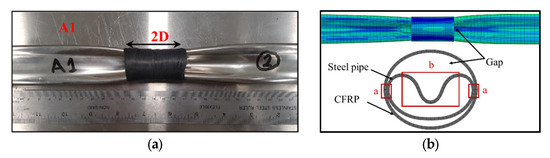 First, to verify the accuracy of the model, we used the same material property parameters as the test group 28D 2. As shown in Figure 1, the CFRP was located at 1/3 and 2/3 of the stainless-steel pipes, with the pipe diameter D = 25.4 mm and the wall thickness t = 0.9 mm, respectively. An initial defect in the shape of the dent was generated at the position 6D away from the end so that the collapse position of the pipe would start from the end. To apply dents, the pipe was clamped in the jaws of a universal testing machine and a rigid semi-circular rod of the same diameter was gradually pressed to produce an ovality ratio of less than 1% Δ0. The defects were quantified by measuring the maximum and minimum diameters (Dmax and Dmin) of the dented pipe and measured by the ovality that Δ0 indicates: Δ0 = (Dmax − Dmin)/(Dmax + Dmin).