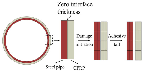 The interaction of pipelines with CFRP was simulated using the bond layer model in ABAQUS®. The material parameters described in the literature were adopted for the interlaminar bonding of the pipe [45]. Since the CFRP is subjected to external water pressure in this study, if the finite thickness method in the literature is used to simulate the adhesive layer, the calculation will not converge during the hydraulic loading process. Therefore, the simulation method of the no-thickness adhesive layer was adopted in this study. As shown in Figure 4, the advantage of this method is that when the CFRP layer is subjected to external water pressure, a hard contact can be set between the CFRP and the steel pipe, and the pressure exerted on the CFRP can be transmitted to the outer surface of the pipe, making it more realistic to restore the process of experiments.