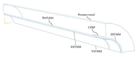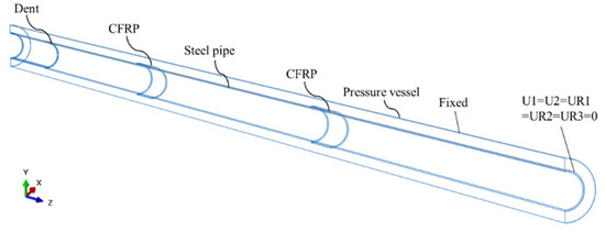 For boundary conditions, the pressure vessel was fixed, and the sides of the steel pipe were set to be symmetrical along the X-axis (XSYMM: U1 = UR2 = UR3 = 0) and along the Y-axis (YSYMM: U2 = UR1 = UR3 = 0). The end of the steel pipe was set to be hinged, allowing axial movement along the pipe. The displacement in the remaining directions was 0. The pipe section at the defect and the section of the CFRP were set to be symmetrical along the Z-axis (ZSYMM = U3 = UR1 = UR2 = 0).