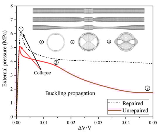 With the continuous injection of water, the pipeline at the defect is the first to contact, as shown in the cross-sectional view 2 in Figure 8. Then, the range of the pipeline instability expands along the axial direction of the pipeline, and the pressure no longer changes significantly, as shown in position 3. This process was referred to as buckling propagation in previous studies. The X-axis represents the change in pipe volume. ΔV represents the volume of water injected into the high-pressure vessel. V represents the internal volume of the pipe.