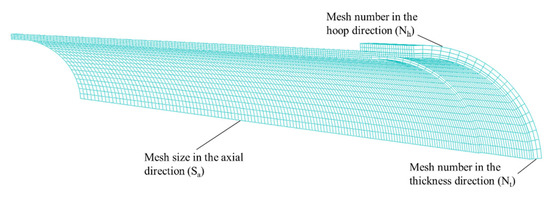 A meshing method with high accuracy and low computational cost was found through the different meshing of the model. Based on the geometry and loading characteristics, a 1/8 model was established to investigate the collapse pressure of the repaired pipes under external pressure. Mesh independence was determined before model verification, and the collapse pressure was used as the index of convergence. The results are summarized in Table 4, and the meanings of each parameter are shown in Figure 10: Nh is the mesh number in the hoop direction of the concrete jacket, Nt is the mesh number in the thickness direction of the CFRP and the steel pipe, Sa is the element size in the axial direction, and Pco is the collapse pressure.