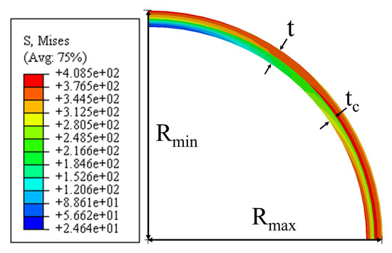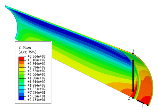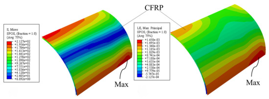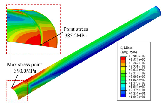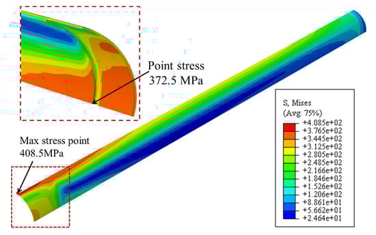 The defects on the junction of the inner side of the steel pipe and the pipeline also have a large stress concentration, reaching 385.2 MPa. It can be seen that the collapse of the steel pipe is closely related to the yield strength of the steel pipe, and the authors of [5] have provided similar explanations. Figure 12 shows the stress distribution of the repaired pipeline at the maximum external water pressure. It can be seen from the highlighted areas in Figure 12 that the maximum stress on the pipeline reaches 408.5 MPa, which exceeds the yield strength of the steel. Similarly, there is stress concentration at the inner junction of the steel pipe, but the stress is smaller than it is for the unpaired pipeline, and the range of stress concentration is significantly larger than it is for the unpaired pipeline. The CFRP can effectively limit the local deformation of the pipeline and disperse the stress inside the pipeline.