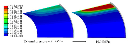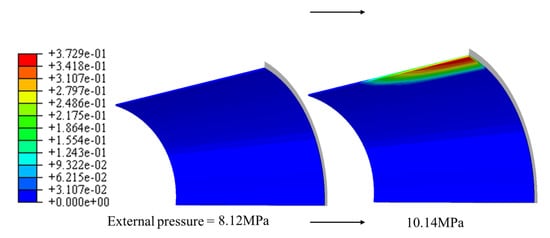 The influence of the interaction between the CFRP and steel pipe on the crushing pressure was further analysed through interlayer bonding. It is shown in Figure 14 that when the external pressure is 8.12 MPa, although the interlayer bonding is damaged, the stiffness of the bonding layer does not decrease, as shown in Figure 15.