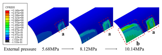The effect of the interlayer adhesion on the steel pipe was analysed above, and the interlayer contact was analysed to further determine the mechanism of the CFRP on the steel pipe. When the pressure was 5.68 MPa, the deformation of the steel pipe was small, and the contact stress with the CFRP was concentrated in the red box in Figure 16, which is the junction between the internal corrosion defect and the complete pipe section.