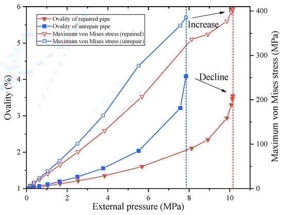 CFRP significantly enhances the external pressure resistance of the pipeline and reduces the ovality when the pipeline is crushed. As shown in Figure 18, the maximum stress and ovality of the steel pipe before and after repair both increase with the increase in external pressure. Before the repair, when the external pressure reached 7.84 MPa, the ovality in the middle of the pipeline defect was 4.08%, and the maximum stress of the repaired pipeline reached 404.67 MPa, which was higher than the maximum stress of 385.18 MPa before the repair. Therefore, when the external pressure reached 10.15 MPa, the local stress of the repaired pipeline exceeded the yield strength of the steel pipe material. However, there is no large-scale collapse due to the limitation in CFRP. According to previous studies, the collapse pressure of the pipeline is positively correlated with the ovality. Therefore, CFRP increases the radial stiffness of the pipeline and the stability of the defect parts, limits the deformation of the steel pipe, and improves the overall stability of the pipeline.