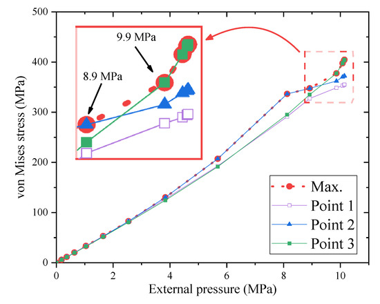 As shown in Figure 19, the external pressure–stress curves for points one, two, and three are extracted, respectively. It can be found from Figure 20 that the initial stress concentration of the steel tube occurs at point one. This shows that when the external water pressure is small, the middle position of the pipeline defect is most prone to deformation. Currently, the interaction force between the CFRP and the steel pipe is still very small. When the external pressure is greater than 2.54 MPa, the maximum stress of the steel pipe appears at point two. This shows that the CFRP has begun to limit the deformation of the defective pipe section. At this time, the overall strength of the defect is increased, the defect pipeline will not have local large deformation, and the stress concentration position will appear at the junction of the defect and the complete pipe section. When the external water pressure is 8.9–9.9 MPa, the maximum stress of the steel pipe changes from point two to point three. It can be seen from Figure 20 that point three maintains a linear increase before crushing, while the stress at point two increases at a slower rate of 8.12 MPa. This is because the bond between the CFRP and the steel pipe is damaged, the bond force at the centre of the pipe defect decreases, and the force on the compressed parts on both sides continues to increase. When the external water pressure is greater than 9.9 MPa, the maximum stress of the pipeline is concentrated in the depression in the centre of the defect position, and the stability of the steel pipe is greatly reduced by this external pressure. The central area undergoes large deformation due to the decrease in the bond strength. CFRP can effectively disperse the stress concentration when the water pressure is small, and the stress at the concave position of the pipeline is no longer a dangerous point in the pipeline. CFRP can significantly improve the stress concentration of steel pipes and delay the occurrence of pipeline collapse.