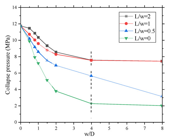 The length of the defect influences the repair effect of the pipeline. As shown in Figure 21, the repaired pipe does not fully restore the strength of the pipe. The curve of L/w = 0 indicates that the collapse pressure of unrepaired pipe decreases with the increase in defect length. When the ratio of the pipeline defect length to diameter w/D > 4, the change in pipeline collapse pressure decreases. The same phenomenon is observed when CFRP fully covers the pipeline defect location. However, if the CFRP does not fully cover the defect position, the collapse pressure of the pipeline will still decrease with the increase in the defect length.