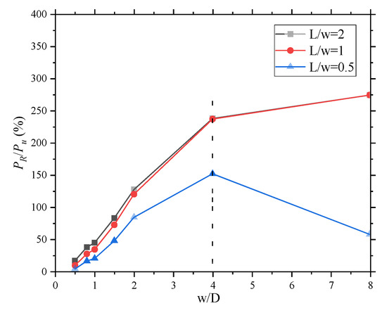 The repair effect of CFRP is not linearly enhanced. As shown in Figure 22, when the defect length/diameter w/D < 2, the increase in the CFRP length can significantly increase the collapse pressure of the pipeline. However, when L/w > 2, the effect of CFRP is small, and the effect of increasing the length of the CFRP is not significant. It can be seen from the data analysis that the collapse pressure of the repaired pipeline is 3.1–274% higher than that of the pipeline before repair. When L/w is less than two, the collapse pressure of the repaired pipe decreases with the increase in defect width. The repair effect increases gradually from 3.1% and reaches the highest when w/D = 4. When w/D is greater than four, the collapse pressure can be increased to 65% of the pipe without defect, which is 274% higher than the unpaired pipe. When the CFRP length is greater than the defect length, the repair effect is similar. When the defect length is less than the diameter, the collapse pressure of the repaired pipeline can reach 72.98–97.53% of the initial external pressure capacity. However, as shown in Figure 22, when the defect length of the pipeline is greater than the CFRP, and the defect length is less than four times the diameter, the repair effect increases with the increase in the defect length; when the defect length is greater than four times the diameter, the repair effect increases. The effect decreases when the defect length increases.