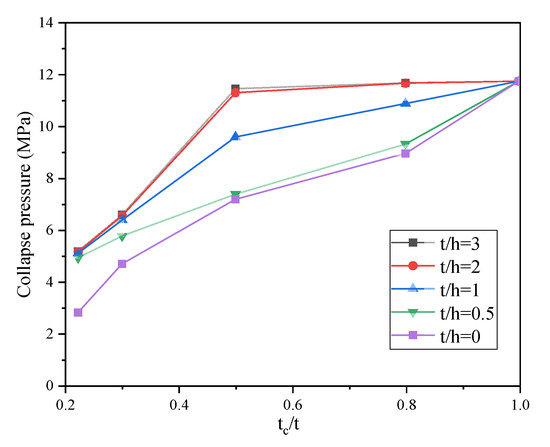 In this section, the influence of different degrees of defects on the repair effect is analysed. tc/t refers to the defect wall thickness/wall thickness. The model used is L/w = 1, w/D = 4. The thickness of the CFRP is 0.5–3 times the wall thickness of the steel pipe, and the wall thickness at the defect is 0.3–0.8 times the wall thickness before corrosion. As shown in Figure 23, when the CFRP thickness is greater than the pipe wall thickness, the repair effect for defects with tc/t < 0.3 differs by 3.09%. When the CFRP thickness is twice the pipe wall thickness, the repair effect is almost the same. For pipes with large wall thickness defects, increasing the thickness of the CFRP has no obvious effect. For steel pipes with small defects, if the thickness tc/t of the defected part is greater than 0.3, increasing the thickness of the CFRP can effectively improve the repair efficiency. It can be seen from the bottom two curves in Figure 23 that when h/t = 0.5, the ultimate bearing capacity of the pipeline is increased by less than 1%.